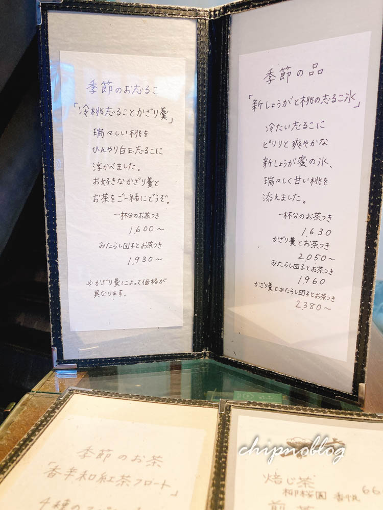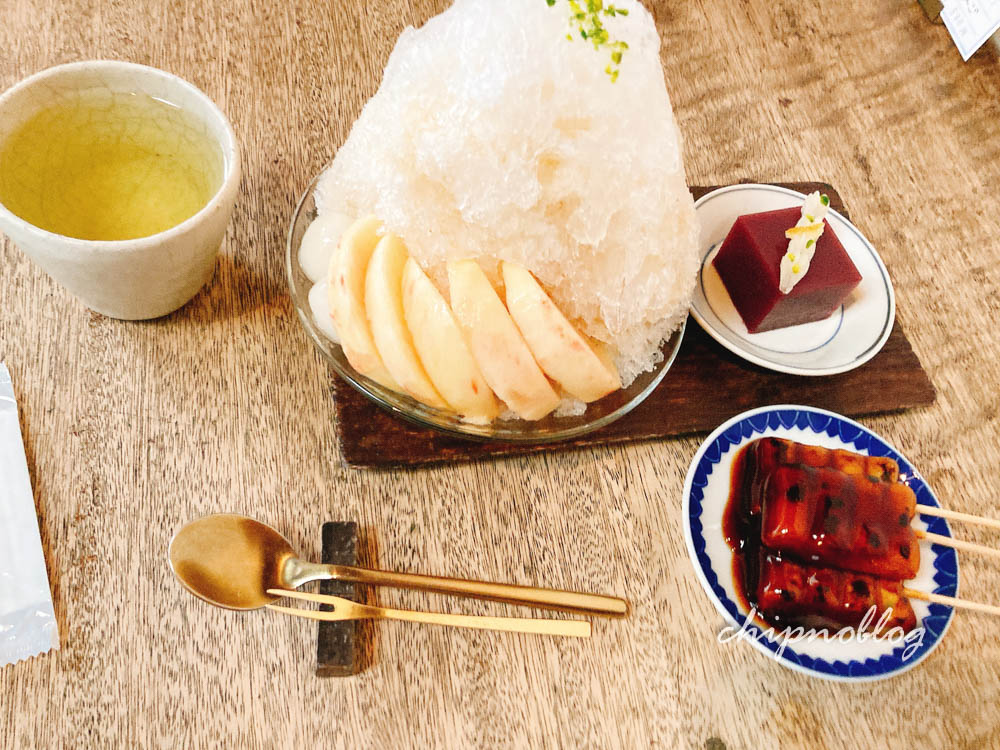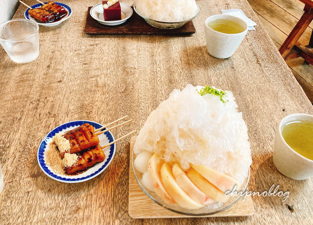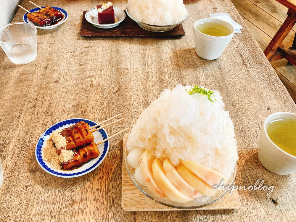 というわけで、もう食べられないしょうがと桃の志るこ氷と、飾り羹、はじめてで最後のうめぞの茶房さんでのみたらし団子。(友はきなこが苦手で、きなこなしです)
