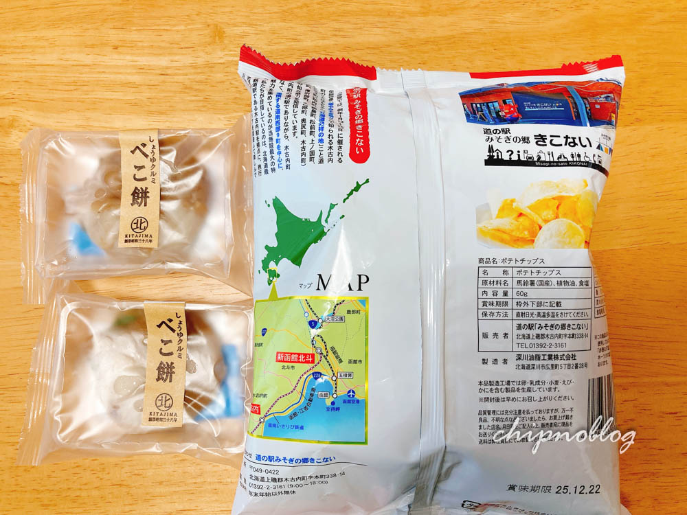 北海道の木古内でレンタカーを借りながら買ったポテチと餅。