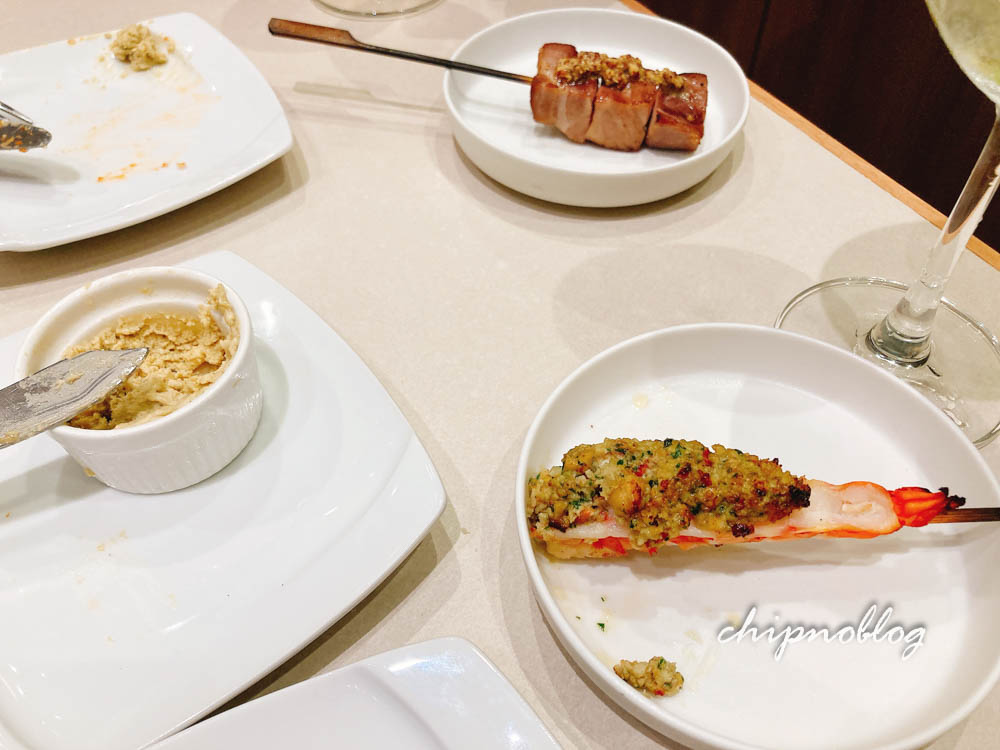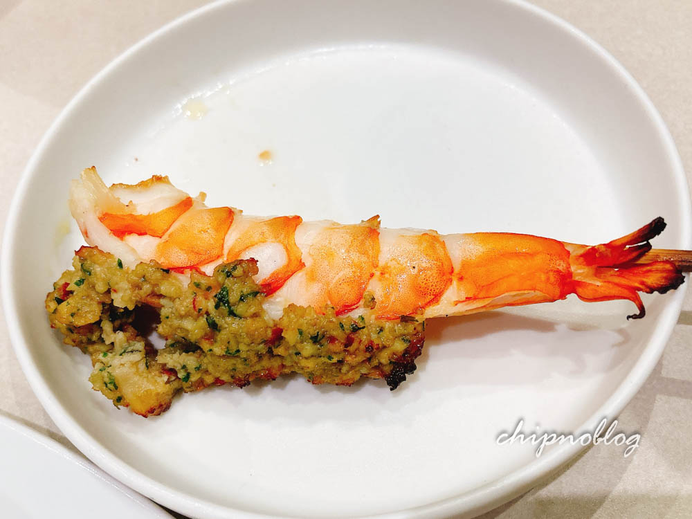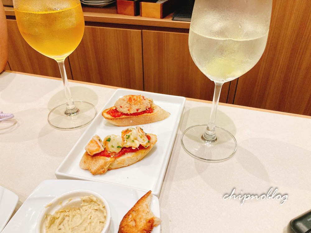 海老とムール貝のブルスケッタと、エビ。甲殻類はおいしい。