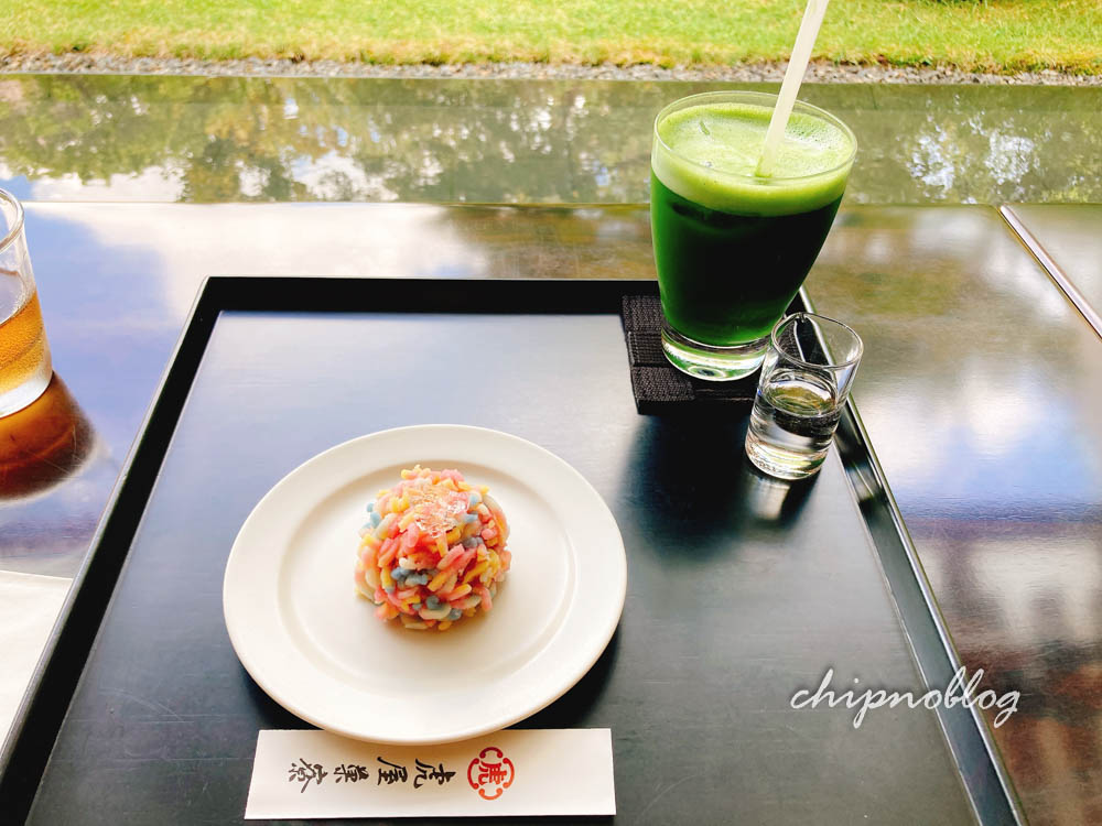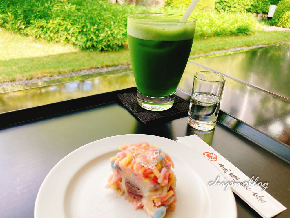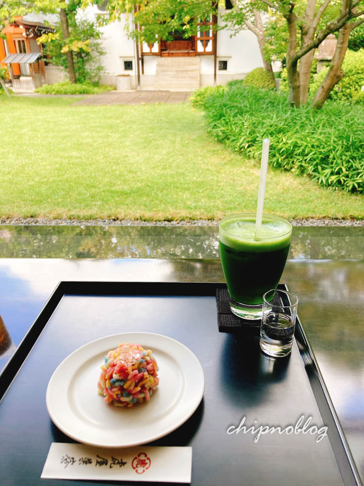 「モントルグイユ通りの賑わい」に、アイス抹茶をあわせました。シロップ別添えがうれしい。