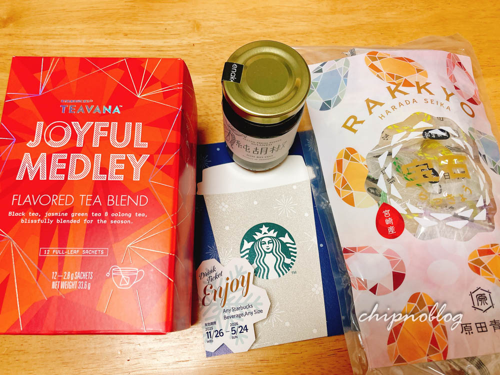 塩漬け胡椒、らっきょう、スタバの紅茶とドリンクチケットもありがとう(‘ω’)ノ