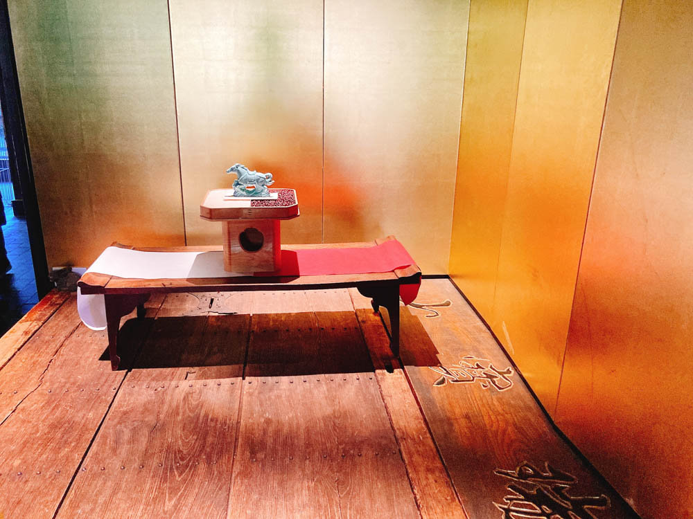 縁起物がたくさん売られていて、ピカピカの俵と金色の小槌を買いました。
